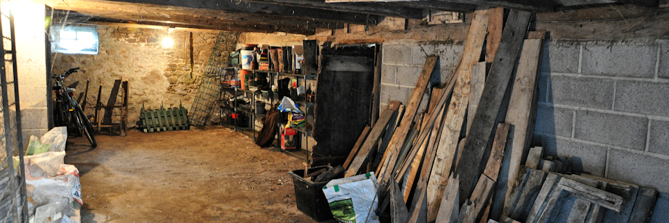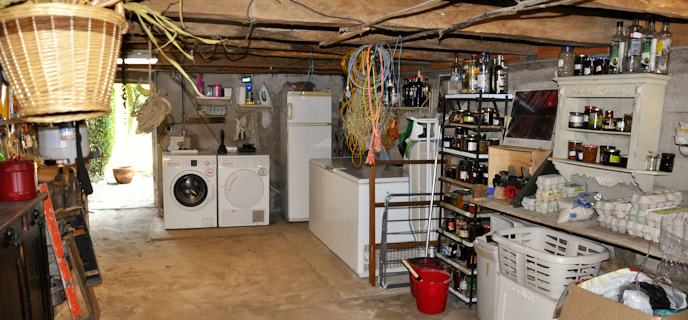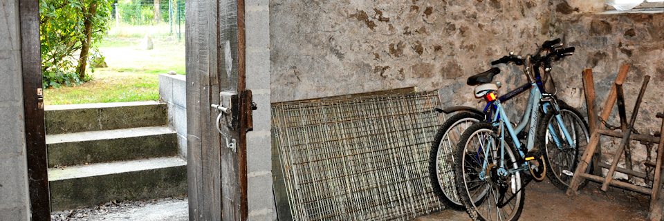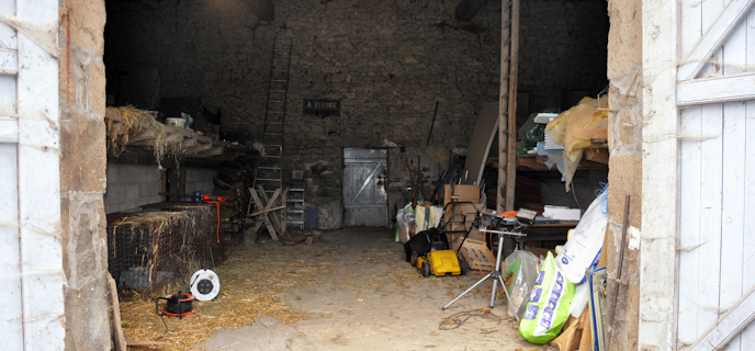 The outbuildings consist of one large barn with storage and stabling to either side, one small lean-to hut in the front garden and a combined henhouse and rabbit "clapier".