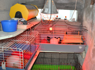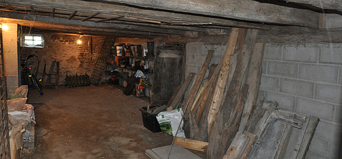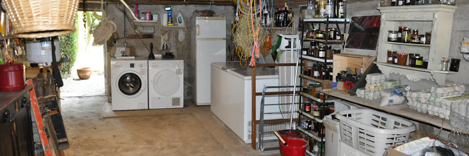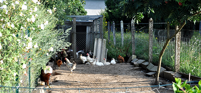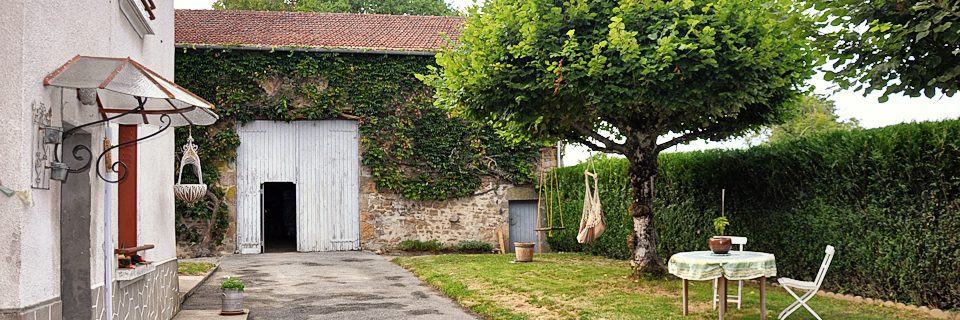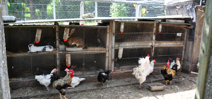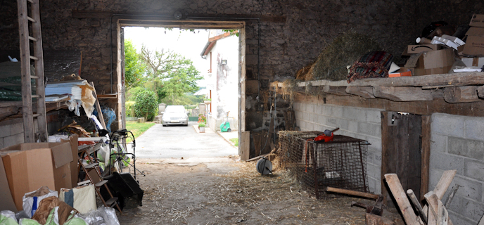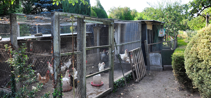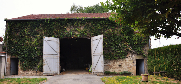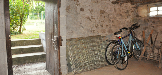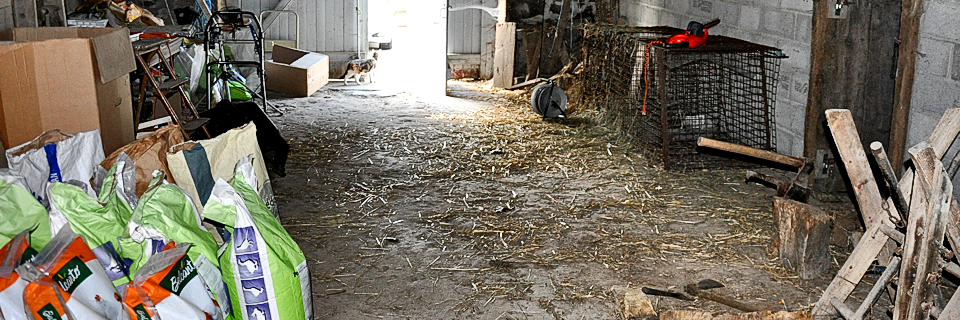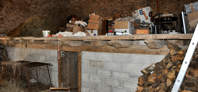 The outbuildings consist of one large barn with storage and stabling to either side, one small lean-to hut in the front garden and a combined henhouse and rabbit "clapier".