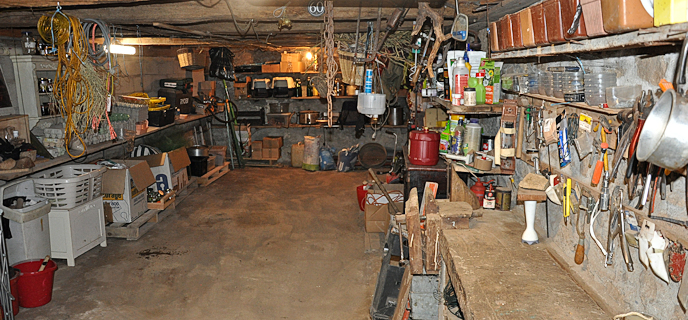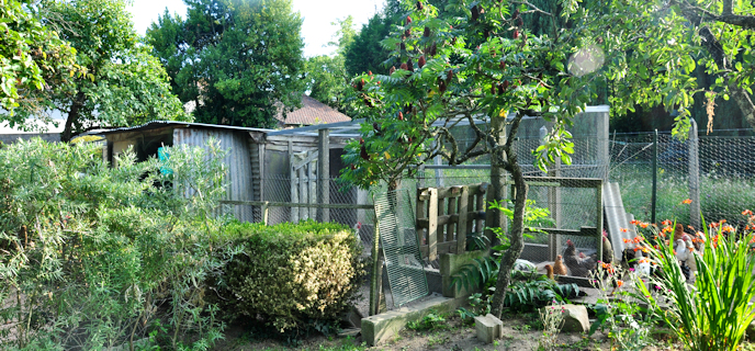 Die Nebengebäude bestehen aus einer großen Scheune mit Lagerung und Stallung zu beiden Seiten, einer kleinen Anbauhütte im Vorgarten und einem kombinierten Hühner- und Kaninchenklapper.